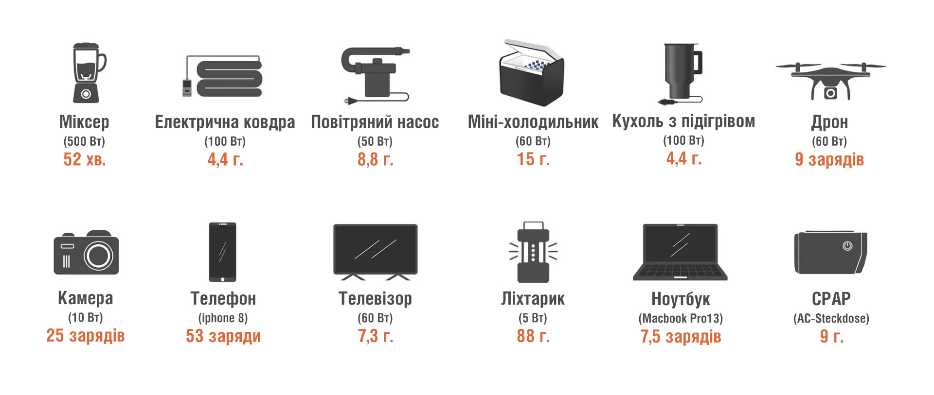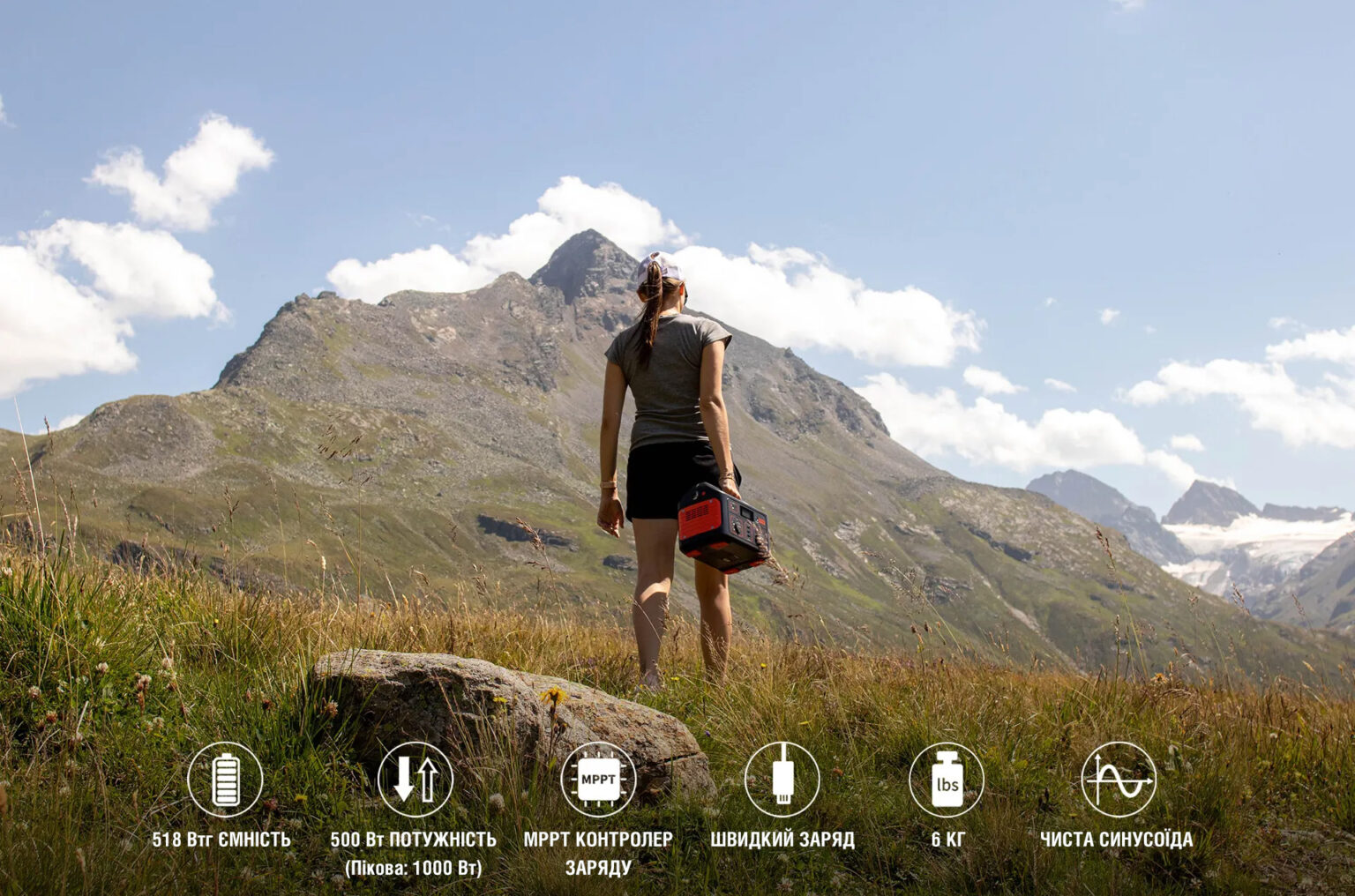 Вам не доведеться турбуватися про мережеву розетку або незручні подовжувачі. Сміливо вирушайте на дослідження природної краси та користуйтеся блендером, скороваркою, проєктором, електроінструментами та іншим обладнанням потужністю до 500 Вт. Ви також можете використовувати його як резервне джерело живлення для освітлення, ноутбуків, телефонів, невеликого холодильника, апарата штучної вентиляції легких CPAP та інших пристроїв під час вимкнення електричної мережі.
