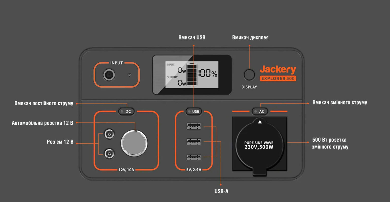 Електростанція Explorer 500 оснащена високоякісним вбудованим контролером заряду MPPT, завдяки якому можна швидко та легко наснажити сонячну електростанцію, під'єднавши сонячну панель Jackery SolarSaga 100W (продається окремо). Також можна заряджати Explorer 500 від розетки, автомобільної розетки 12 В або електрогенератора.